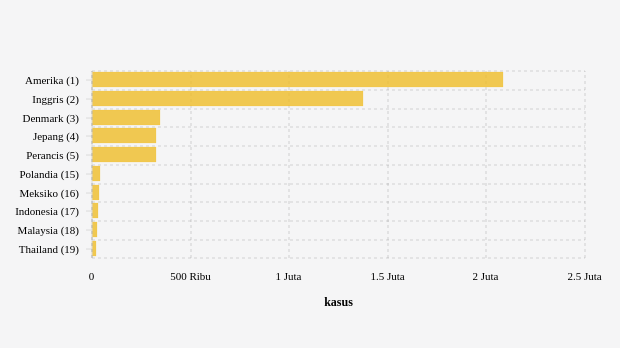 Kemudian, jumlah kasus Omicron di Denmark naik 1,3 persen menjadi 344,94 ribu kasus dibandingkan pekan sebelumnya, Jepang dengan jumlah kasus Omicron 326,83 ribu kasus (naik 3,01%) dan Perancis dengan jumlah kasus Omicron 323,22 ribu kasus (naik 1,39%)
