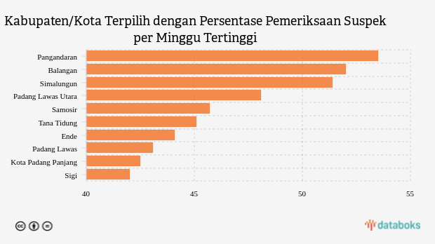 Pangandaran berada di urutan pertama. Dengan jumlah penduduk 407,35 ribu jiwa, persentase pemeriksaan suspek per minggu di tempat ini tercatat 53,45 persen. Adapun angka positive rate terakhir adalah 5,64 persen. Positive rate di wilayah ini naik dibandingkan rasio pada pekan sebelumnya.