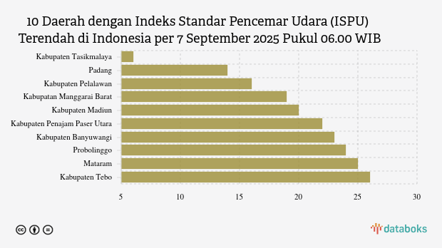 Kualitas udara Kabupaten Tasikmalaya pada Minggu (7/9/2025) pagi ini paling bersih di Indonesia.