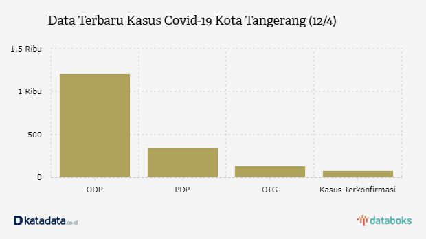 Berdasarkan data Minggu (12/4), terdapat 76 kasus terkonfirmasi positif Covid-19 di Kota Tangerang. Sembilan di antaranya meninggal dunia. Terdapat 129 orang tanpa gejala (OTG), 1.201 orang dalam pemantauan (ODP), dan 339 pasien dalam pengawasan (PDP).