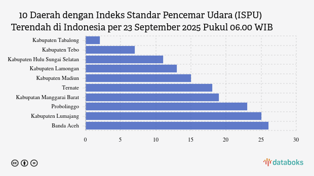 Berikut ini daftar 10 kota dengan kualitas udara paling bersih di Indonesia menurut KLHK pada Selasa, 23 September 2025 pukul 06.00 WIB.