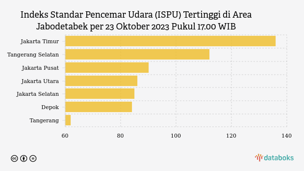 Kualitas udara Jakarta Timur sore ini terburuk di Jabodetabek berdasarkan data Indeks Standar Pencemar Udara (ISPU) KLHK. Adapun indeks kualitas udara Jakarta Timur tercatat 136 pada Senin (23/10/2023) pukul 17.00 WIB.