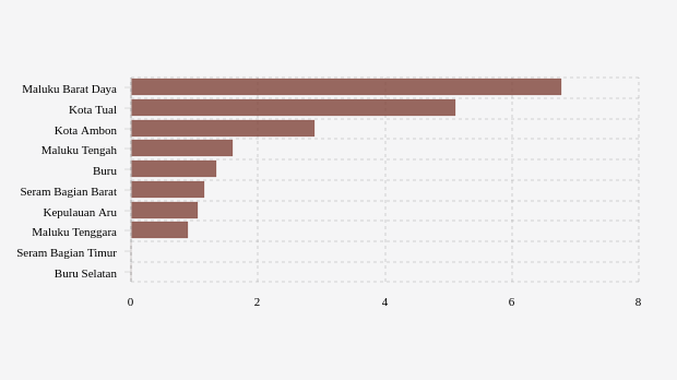 Jumlah penambahan konfirmasi positif Covid-19 di Maluku saat ini paling tinggi terjadi di Maluku Barat Daya dengan jumlah enam kasus per 100 ribu penduduk per minggu pada Sabtu, 12 Maret 2022. Angka ini selisih 1,7 kasus dibandingkan catatan kasus di wilayah lain yang berada di urutan kedua.