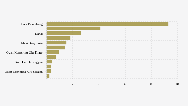 Muara Enim dan Musi Banyuasin berada di posisi selanjutnya dengan catatan penggunaan rawat inap rumah sakit mingguan sebesar 1,81 pasien per 100 ribu penduduk/minggu dan 1,48 pasien per 100 ribu penduduk/minggu.