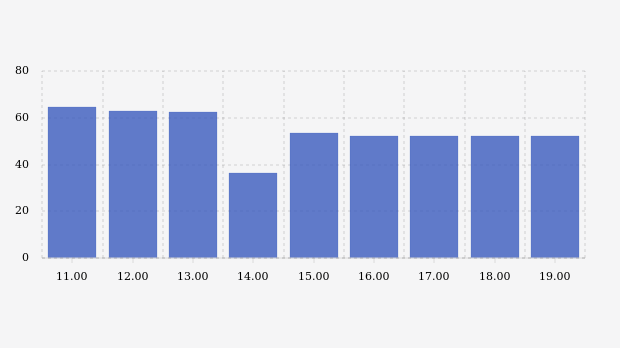 Konsentrasi PM2.5 udara Jakarta terendah berada di level 36,2 µg/m³ pada pukul 14.00 WIB, sedangkan konsentrasi PM2.5 tertinggi pada pukul 11.00 WIB dengan nilai 64,4 µg/m³.