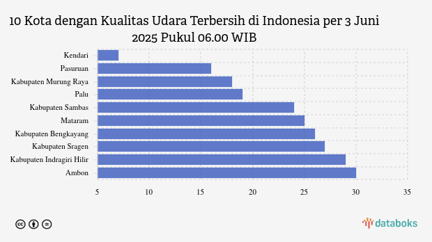 Kualitas udara Kendari pagi ini paling bersih di Indonesia. Berdasarkan indeks kualitas udara versi Kementerian Lingkungan Hidup dan Kehutanan (KLHK), Kendari memiliki skor 7 pada Selasa (3/6/2025) pukul 06.00 WIB.