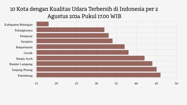 Berikut daftar lengkap 10 kota dengan kualitas udara paling bersih di Indonesia menurut KLHK pada Jumat, 2 Agustus 2024 pukul 17.00 WIB.