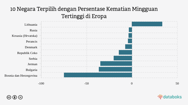 Lithuania berada di urutan pertama dengan penambahan kematian per minggu tumbuh 33,33 persen. Di negara ini, Worldmeter mencatat jumlah kematian sebanyak delapan jiwa naik 60 persen dibandingkan hari sebelumnya.