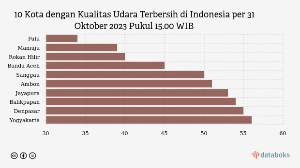 Berarti, pada Selasa (31/10/2023) pukul 15.00 WIB, kota dengan kualitas udara baik, yaitu Palu, Mamuju, Rokan Hilir, Banda Aceh, dan Sanggau. Adapun, 5 kota lainnya, yakni Ambon, Jayapura, Balikpapan, Denpasar, dan Yogyakarta memiliki kualitas udara sedang.