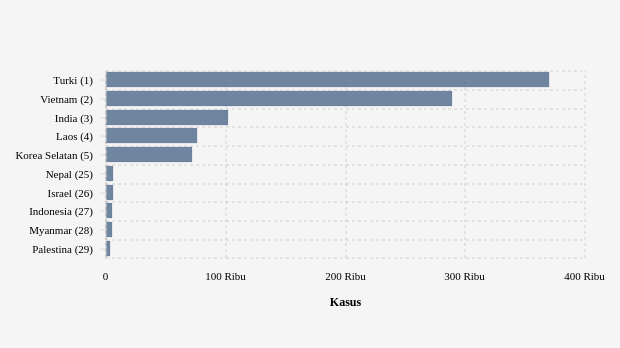 Sementara itu di urutan teratas dengan kasus aktif tertinggi di Asia adalah Turkey. Negara ini mencatatkan kasus aktif sebanyak 369,78 ribu orang. Kemudian Vietnam ada di urutan kedua. Vietnam mencatatkan kasus aktif sebanyak 288,8 ribu orang.