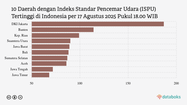 Berikut daftar 10 provinsi dengan indeks kualitas udara terburuk di Indonesia pada Minggu, 17 Agustus 2025 pukul 18.00 WIB.