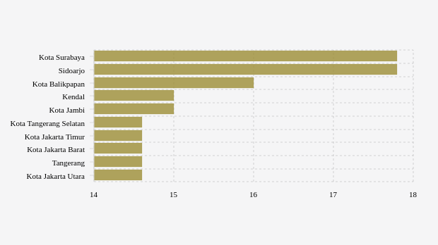 tracing lima kabupaten/kota teratas dengan angka lebih dari 15 persen, yaitu kota Surabaya, Sidoarjo, kota Balikpapan, Kendal dan kota Jambi dengan masing-masing nilai 17,83 persen, 17,83 persen, 16 persen, 15 persen dan 15 persen.