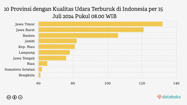 Berikut daftar 10 provinsi dengan indeks kualitas udara terburuk di Indonesia pada Senin, 15 Juli 2024 pukul 08.00 WIB.