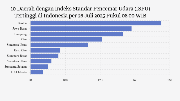 Berikut daftar 10 provinsi dengan indeks kualitas udara terburuk di Indonesia pada Sabtu, 26 Juli 2025 pukul 08.00 WIB.