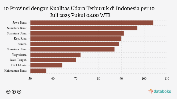 Berikut daftar 10 provinsi dengan indeks kualitas udara terburuk di Indonesia pada Kamis, 10 Juli 2025 pukul 08.00 WIB.