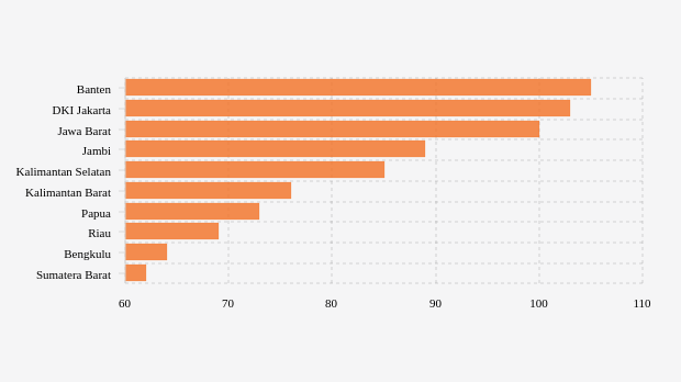 Di bawah Banten, ada DKI Jakarta yang menempati posisi kedua terburuk di Indonesia dengan indeks kualitas udara 103. Kemudian, di posisi ketiga ada Jawa Barat dengan indeks kualitas udara 100.