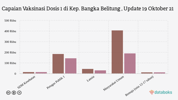 Cakupan vaksinasi dosis 1 di provinsi Kep. Bangka Belitung, hari ini Selasa, 19 Oktober 2021, telah mencapai 58,2 persen. Angka ini setara dengan 662,2 ribu peserta vaksin dari target yang ditetapkan sebanyak 1,14 juta orang. Sementara untuk vaksinasi dosis 2 hingga kemarin telah tercapai 34,09 persen dari target.