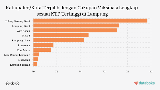 Tulang bawang barat adalah kabupaten di urutan pertama dengan cakupan vaksinasi lengkap sesuai KTP tertinggi sebesar 79,73 persen. Kondisi cakupan vaksinasi lengkap sesuai KTP di kabupaten ini terlihat lebih baik dibandingkan pekan sebelumnya yang tercatat 79,07 persen.
