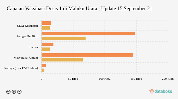 Cakupan vaksinasi dosis 1 di provinsi Maluku Utara, hari ini Rabu, 15 September 2021, telah mencapai 23,42 persen. Angka ini setara dengan 332,04 ribu peserta vaksin dari target yang ditetapkan sebanyak 1.42 juta orang. Sementara untuk vaksinasi dosis 2 hingga kemarin telah tercapai 11,54 persen dari target.