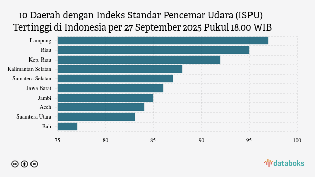 Berikut daftar 10 provinsi dengan indeks kualitas udara terburuk di Indonesia pada Sabtu, 27 September 2025 pukul 18.00 WIB.