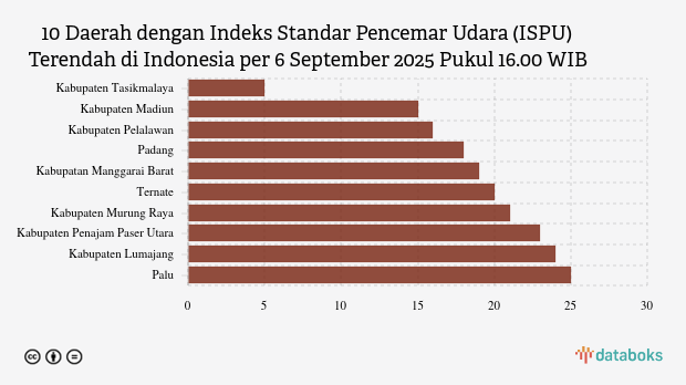Kualitas udara Kabupaten Tasikmalaya sore ini paling bersih di Indonesia. Berdasarkan indeks kualitas udara versi Kementerian Lingkungan Hidup dan Kehutanan (KLHK), Kabupaten Tasikmalaya memiliki skor 5 pada Sabtu (6/9/2025) pukul 16.00 WIB.