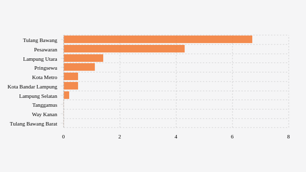 Tulang bawang adalah kabupaten di urutan pertama dengan BOR tertinggi sebesar 6,67 persen. Kondisi BOR di kabupaten ini memperlihatkan ada kemajuan dengan adanya penurunan dibandingkan pekan sebelumnya yang tercatat 6,67 persen.