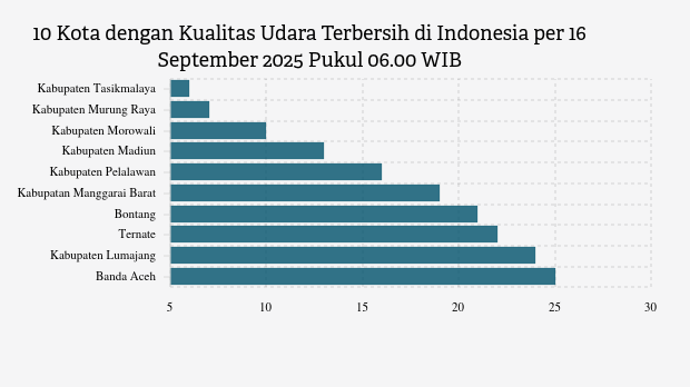 Berikut ini daftar 10 kota dengan kualitas udara paling bersih di Indonesia menurut KLHK pada Selasa, 16 September 2025 pukul 06.00 WIB.