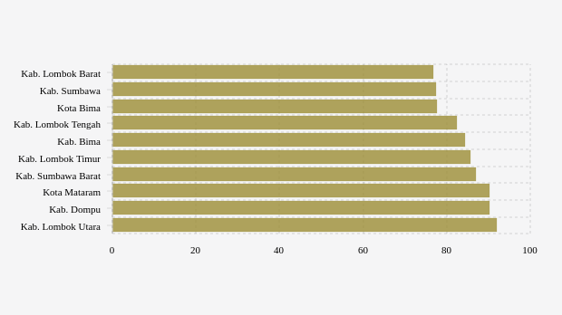 Kabupaten Lombok Barat di urutan pertama. Sampai dengan kemarin, untuk vaksinasi dosis 2 wilayah ini telah mencatatkan 76,86 persen. Angka ini menjadi yang terendah dibandingkan 10 kabupaten/kota lainnya. Sedangkan untuk pencapaian dosis 1, sampai dengan kemarin sudah tercapai 91,63 persen atau diikuti oleh 946,36 ribu peserta vaksin.