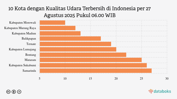 Berikut ini daftar 10 kota dengan kualitas udara paling bersih di Indonesia menurut KLHK pada Rabu, 27 Agustus 2025 pukul 06.00 WIB.