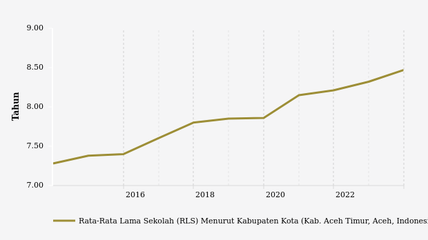 RLS tersebut menunjukkan rata-rata penduduk Aceh Timur hanya sekolah sampai jenjang kelas VIII. Namun, RLS itu masih di bawah rata-rata RLS nasional yang 8,77 tahun pada 2023.