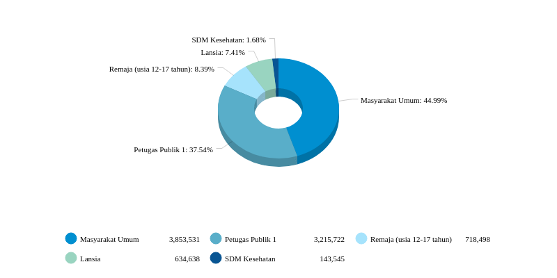 Vaksinasi untuk petugas publik dengan target 1982,76 ribu jiwa. Angka vaksinasi di tahap 1 dilaporkan telah mencapai 3215,72 ribu jiwa (162,18 persen target) dan untuk vaksinasi tahap dua dengan capaian 92,52 persen atau berhasil tersalurkan sebanyak 1834,41 ribu jiwa.