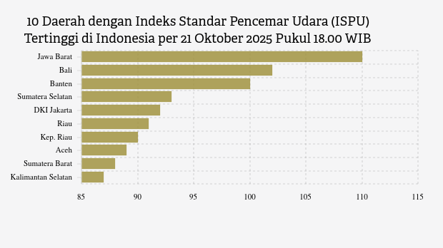 Berikut daftar 10 provinsi dengan indeks kualitas udara terburuk di Indonesia pada Selasa, 21 Oktober 2025 pukul 18.00 WIB.