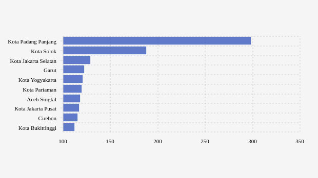 Vaksinasi lansia lima kabupaten/kota teratas dengan angka lebih dari 120,27 persen, yaitu kota Padang Panjang, kota Solok, kota Jakarta Selatan, Garut dan kota Yogyakarta dengan masing-masing nilai 298,1 persen, 187,57 persen, 128,59 persen, 122,01 persen dan 120,27 persen.
