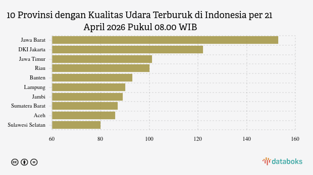 Kualitas Udara di Jawa Barat pagi ini terburuk di Indonesia. Berdasarkan halaman Indeks Standar Pencemar Udara (ISPU) Kementerian Lingkungan Hidup dan Kehutanan (KLHK) pada Selasa (21/4/2026) pukul 08.00 WIB terungkap bahwa indeks kualitas udara di Jawa Barat sebesar 153.