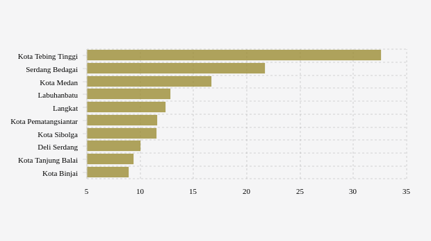 Sebaliknya untuk Serdang Bedagai, data Kementerian Kesehatan memperlihatkan positivity rate aglomerasi tujuh hari terakhir sebesar 21,74 persen. Angka ini lebih tinggi dibandingkan pekan sebelumnya yang baru 16,25 persen. Di urutan berikutnya kota Medan. Kota di provinsi Sumatera Utara ini mencatatkan positivity rate aglomerasi tujuh hari terakhir sebesar 16,66 persen