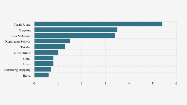 Sebaliknya untuk Soppeng, data Kementerian Kesehatan memperlihatkan jumlah konfirmasi aglomerasi positif Covid-19 mingguan sebesar 3,48 jiwa per 100 ribu penduduk/minggu. Angka ini lebih tinggi dibandingkan pekan sebelumnya yang baru 1,3 jiwa per 100 ribu penduduk/minggu. Di urutan berikutnya kota Makassar. Kabupaten di provinsi Sulawesi Selatan ini mencatatkan jumlah konfirmasi aglomerasi positif Covid-19 mingguan sebesar 3,44 jiwa per 100 ribu penduduk/minggu