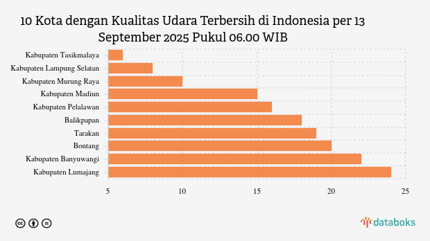 Kualitas udara Kabupaten Tasikmalaya pagi ini paling bersih di Indonesia. Berdasarkan indeks kualitas udara versi Kementerian Lingkungan Hidup dan Kehutanan (KLHK), Kabupaten Tasikmalaya memiliki skor 6 pada Sabtu (13/9/2025) pukul 06.00 WIB.