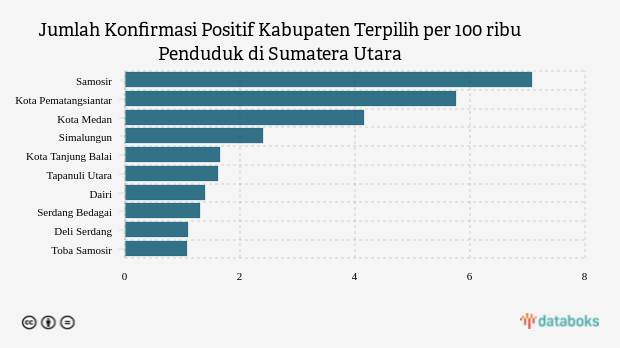 Jumlah penambahan konfirmasi positif Covid-19 di Sumatera Utara saat ini paling tinggi terjadi di Samosir dengan jumlah tujuh kasus per 100 ribu penduduk per minggu pada Rabu, 6 April 2022. Angka ini selisih 1,3 kasus dibandingkan catatan kasus di wilayah lain yang berada di urutan kedua.