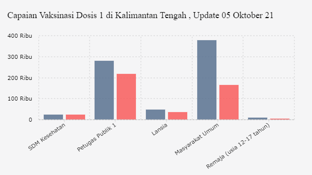 Cakupan vaksinasi dosis 1 di provinsi Kalimantan Tengah, hingga kemarin Selasa, 05 Oktober 2021, telah mencapai 38,23 persen. Angka ini setara dengan 778,43 ribu peserta vaksin dari target yang ditetapkan sebanyak 2,04 juta orang. Sementara untuk vaksinasi dosis 2 hingga kemarin telah tercapai 23,15 persen dari target.