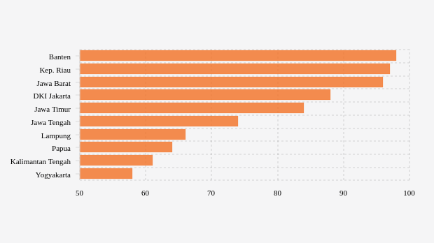 Di bawah Banten, ada Kep. Riau yang menempati posisi kedua terburuk di Indonesia dengan indeks kualitas udara 97. Kemudian, di posisi ketiga ada Jawa Barat dengan indeks kualitas udara 96.