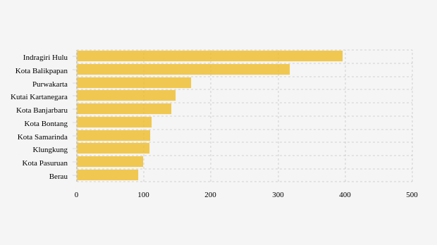 Urutan lima teratas dimulai dari yang terbesar adalah Indragiri Hulu, kota Balikpapan, Purwakarta, Kutai Kartanegara dan kota Banjarbaru dengan masing-masing rasio 396,21 persen, 317,39 persen, 169,97 persen, 146,9 persen dan 141,07 persen.
