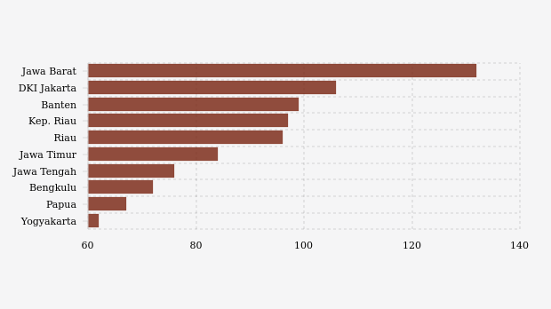 Di bawah Jawa Barat, ada DKI Jakarta yang menempati posisi kedua terburuk di Indonesia dengan indeks kualitas udara 106. Kemudian, di posisi ketiga ada Banten dengan indeks kualitas udara 99.