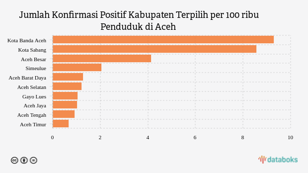 Jumlah penambahan konfirmasi positif Covid-19 di Aceh saat ini paling tinggi terjadi di kota Banda Aceh dengan jumlah 9,28 kasus per 100 ribu penduduk per minggu pada Rabu, 28 September 2022. Angka ini selisih 0,7 kasus dibandingkan catatan kasus di wilayah lain yang berada di urutan kedua.