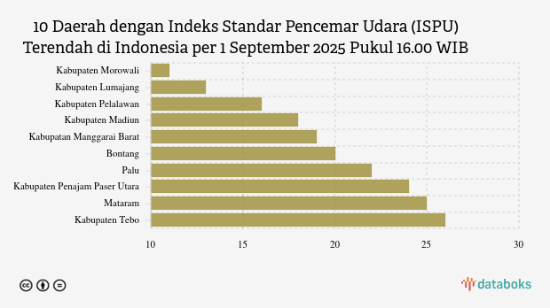 Berikut ini daftar 10 kota dengan kualitas udara paling bersih di Indonesia menurut KLHK pada Senin, 1 September 2025 pukul 16.00 WIB.