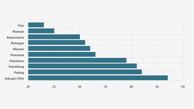 Pada waktu tersebut, kualitas udara Palu tergolong baik yang berarti kadar polutan di udara Palu sangat minim. Selanjutnya, Mamuju menempati posisi kedua dengan indeks kualitas udara 25. Berikutnya, ada Banjarmasin di posisi ketiga dengan indeks kualitas udara 30.