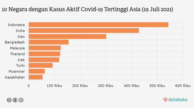 Setelah Indonesia, India menyusul dengan kasus aktif sebanyak 428,7 ribu. Kemudian Iran sebanyak 301 ribu, Bangladesh 154,1 ribu, dan Malaysia 124,6 ribu kasus aktif.