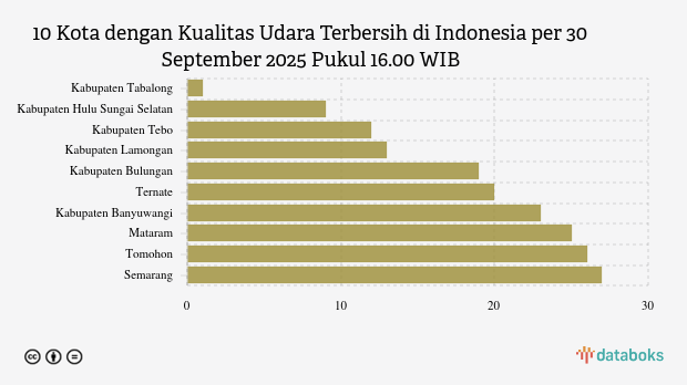 Berikut ini daftar 10 kota dengan kualitas udara paling bersih di Indonesia menurut KLHK pada Selasa, 30 September 2025 pukul 16.00 WIB.