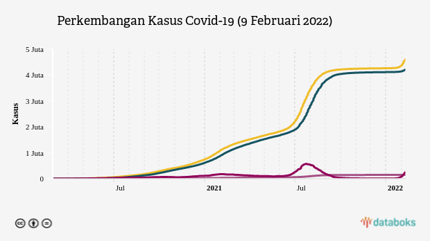 Pemerintah melaporkan kasus Covid-19 di Indonesia bertambah 46.843 kasus pada Rabu (9/2). Dengan begitu, total kasusnya menjadi 4.626.936 kasus. Sebanyak 4.216.328 orang di antaranya telah dinyatakan sembuh (91.13%) dan 144.784 orang meninggal dunia (3.13%), sementara sisanya masih menjalani perawatan.