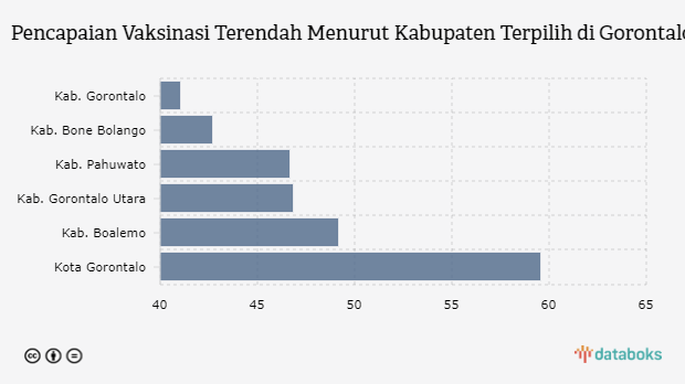 Sebagian wilayah kabupaten/kota di provinsi Gorontalo masih mencatatkan tingkat vaksinasi yang cukup rendah dibandingkan wilayah lainnya. Beberapa kabupaten/kota tersebut di antaranya kabupaten Gorontalo, kabupaten Bone Bolango dan kabupaten Pahuwato.