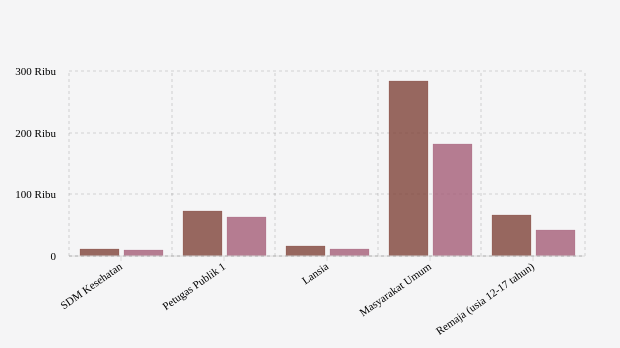 Vaksinasi ke petugas publik dengan target 116,33 ribu jiwa. Vaksinasi dosis 1 dilaporkan telah mencapai 73,39 ribu jiwa (63,09 persen target) dan dosis 2 dengan capaian 53,87 persen atau berhasil tersalurkan sebanyak 62,66 ribu jiwa.